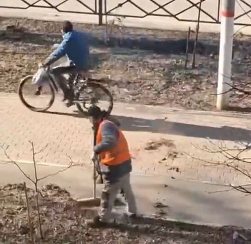 В Химках заметили дворников, которые сначала разбросали листья по пешеходной дорожке, сфотографировались, а затем все обратно смели.