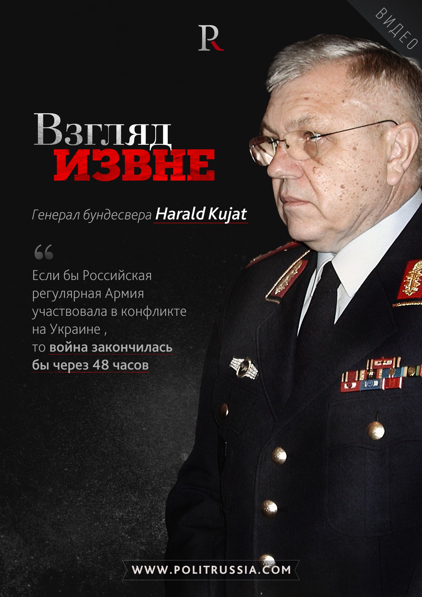 Генерал бундесвера Харалд Куйят (Harald Kujat) в известном ток-шоу на Первом канале Германии заявил:- «...если бы Российская регулярная армия участвовала в конфликте на Донбассе, то война закончилась бы через 48 часов, а Киев был взят через шесть дней.»