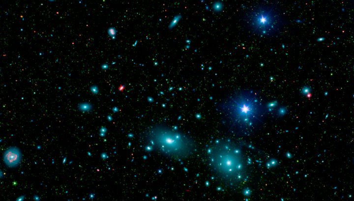 Скопление галактик Abell 1689 – гравитационная линза, искажающая свет всех галактик, находящихся за ней. Тёмная материя, определяющая массу большей части макрообъекта, также принимает участие в процессе, хотя мы и не наблюдаем её напрямую (фото NASA JPL/Caltech and STScI).